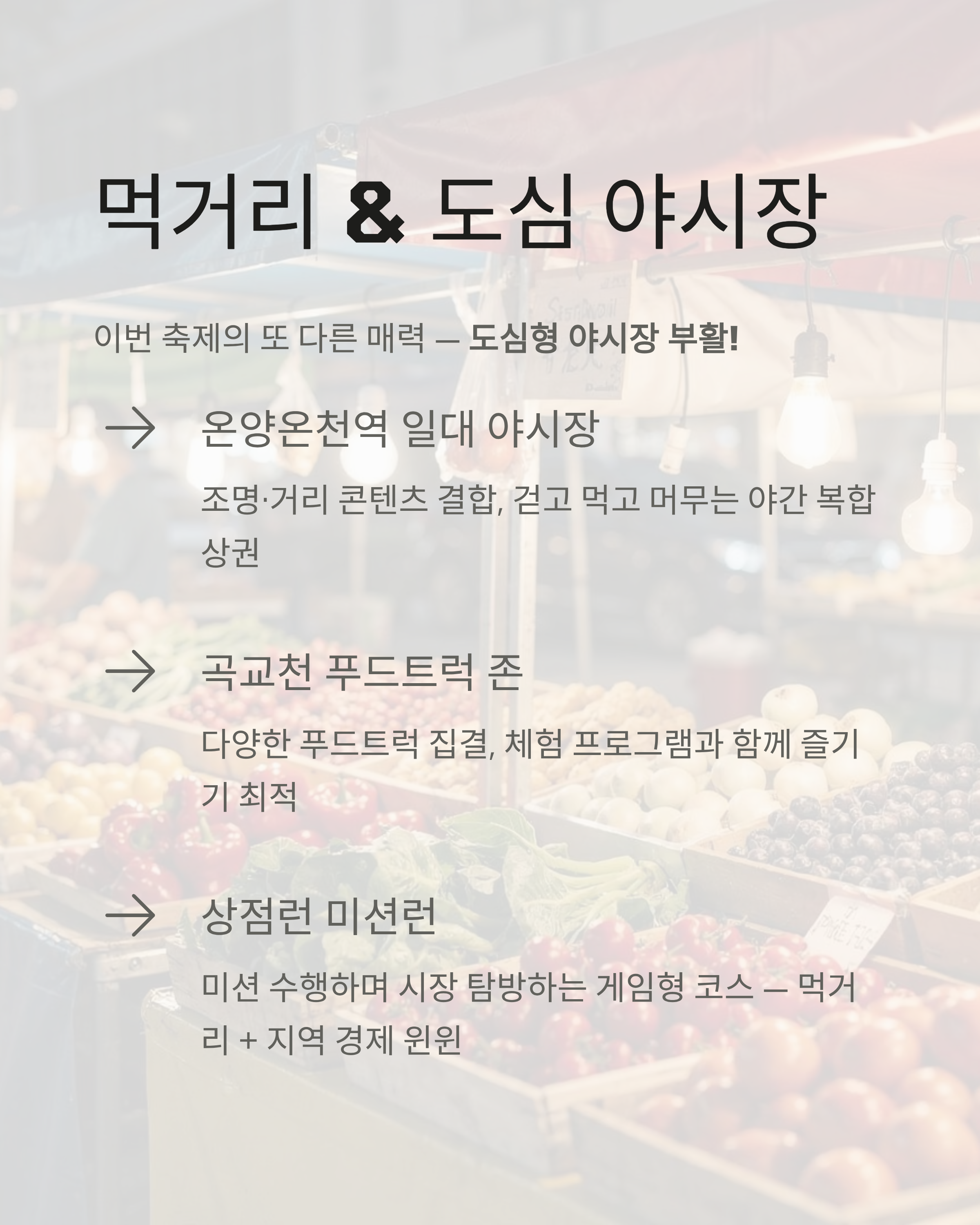 과거 곡교천 야시장의 향수를 도심형 야시장으로 재해석한 콘셉트입니다. 온양온천역과 전통시장 일대 먹거리존이 조명과 거리 콘텐츠가 결합돼 걷고, 먹고, 머무는 야간 복합상권으로 확장됐습니다.