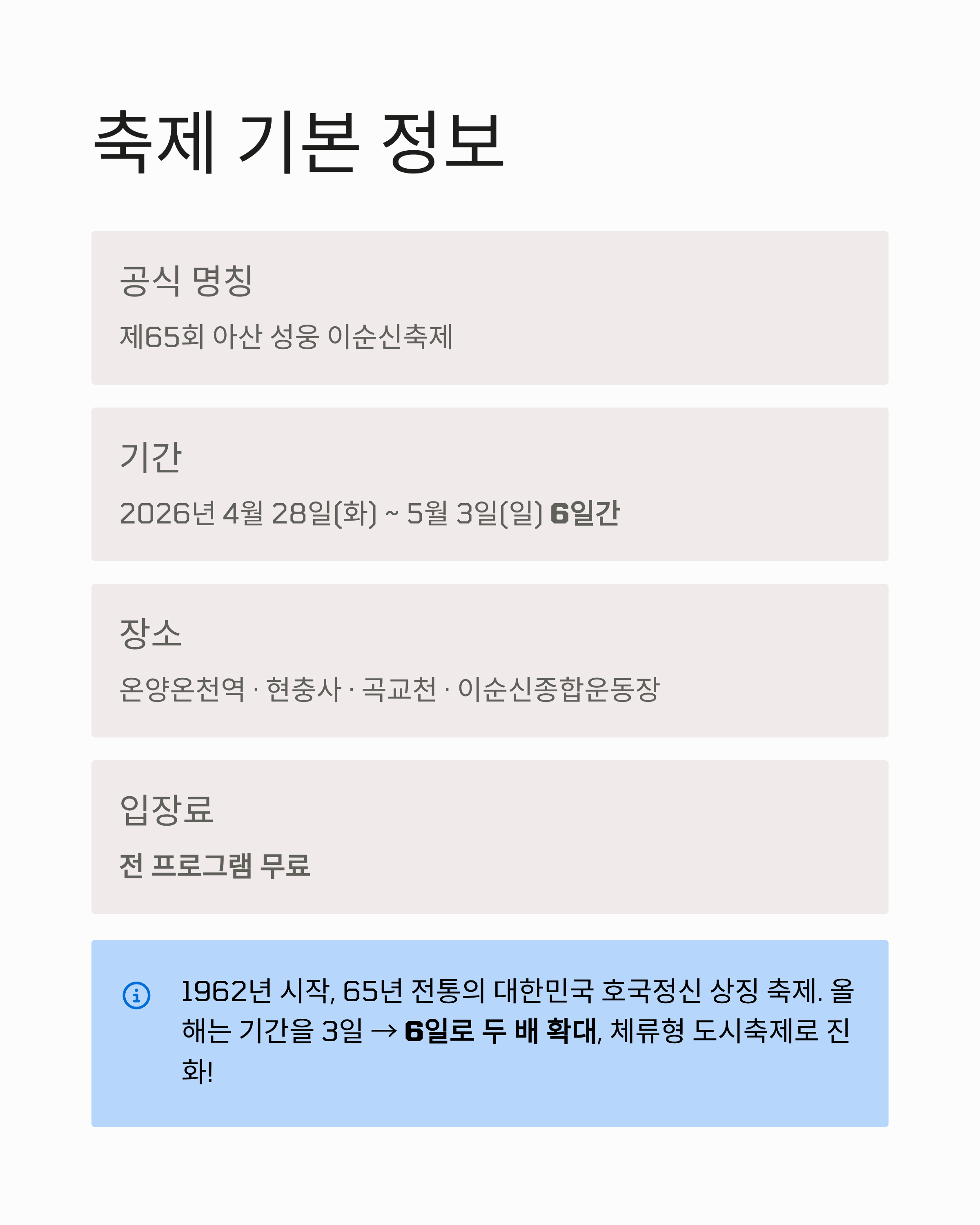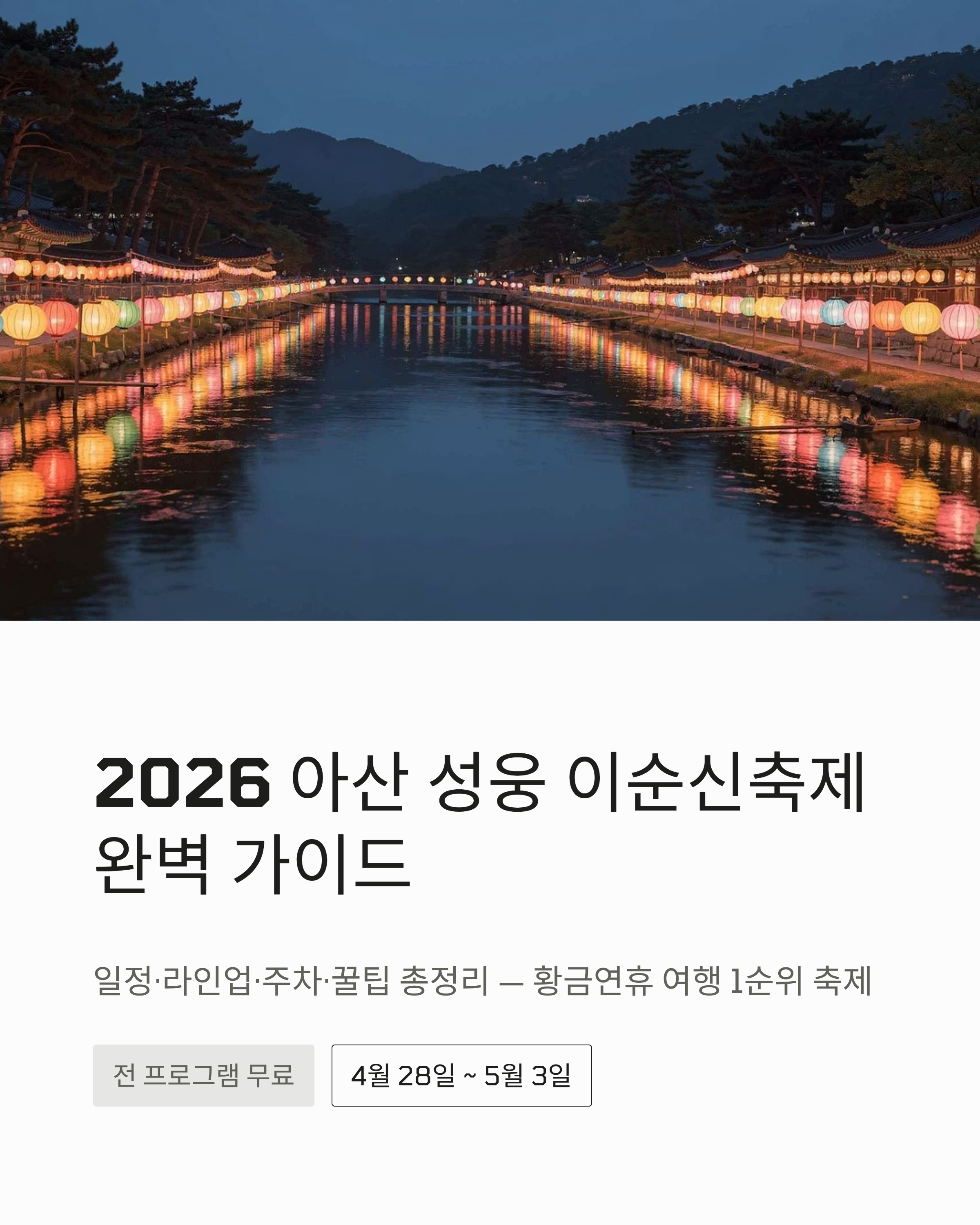 이 글에서는 2026년 아산 이순신축제의 전체 일정, 가수 라인업, 장소별 프로그램, 가는 길, 주차 정보, 먹거리, 실전 꿀팁까지 한 번에 정리했습니다. 충남 여행을 계획 중이시거나 황금연휴에 무료 콘서트와 가족 나들이를 동시에 즐기고 싶으신 분들께 꼭 필요한 정보만 담았으니, 끝까지 읽어보시면 일정 짜는 데 큰 도움이 되실 거예요.