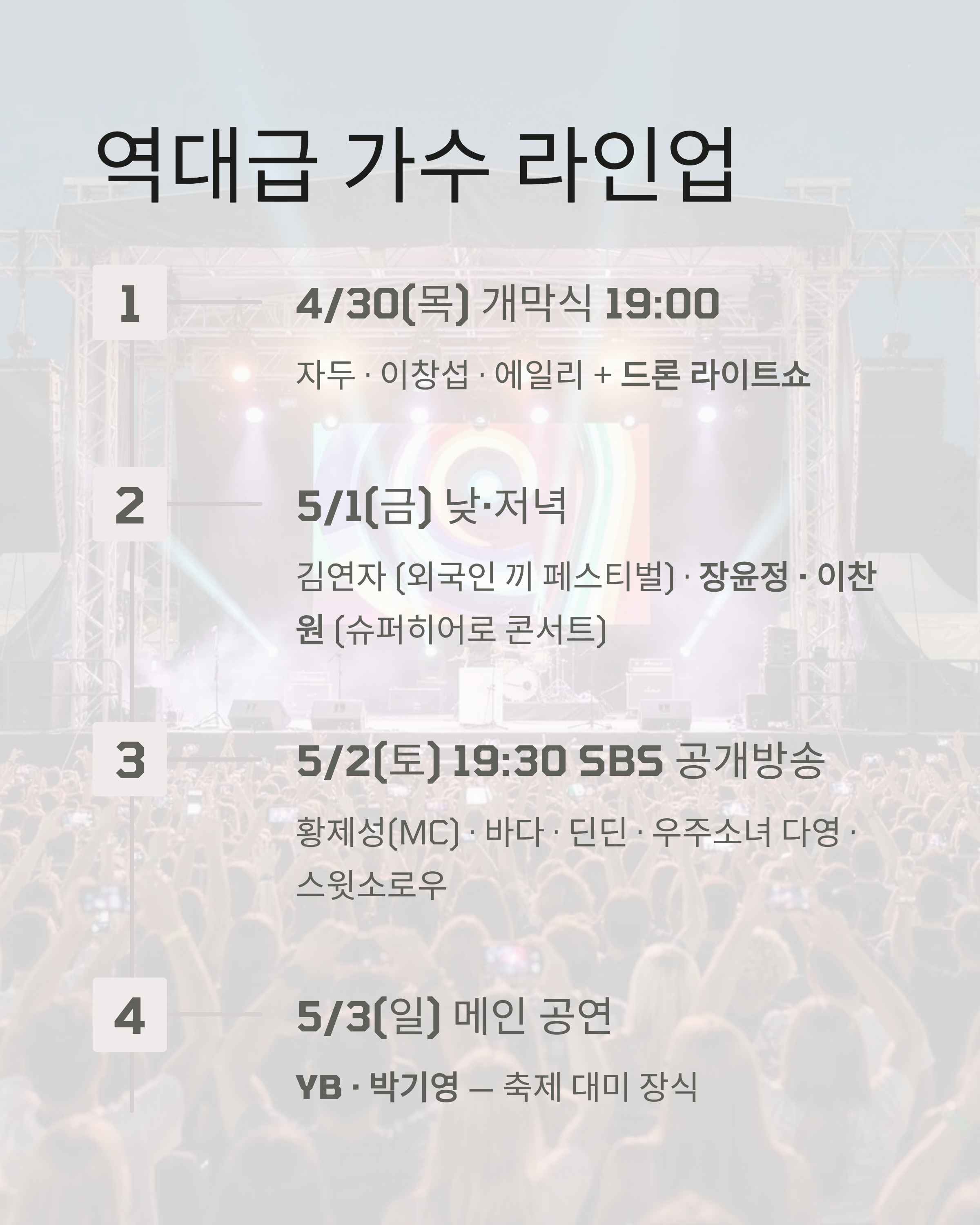 | 4/30(목) | 19:00 | 개막식 | 자두, 이창섭, 에일리 + 드론 라이트쇼 |