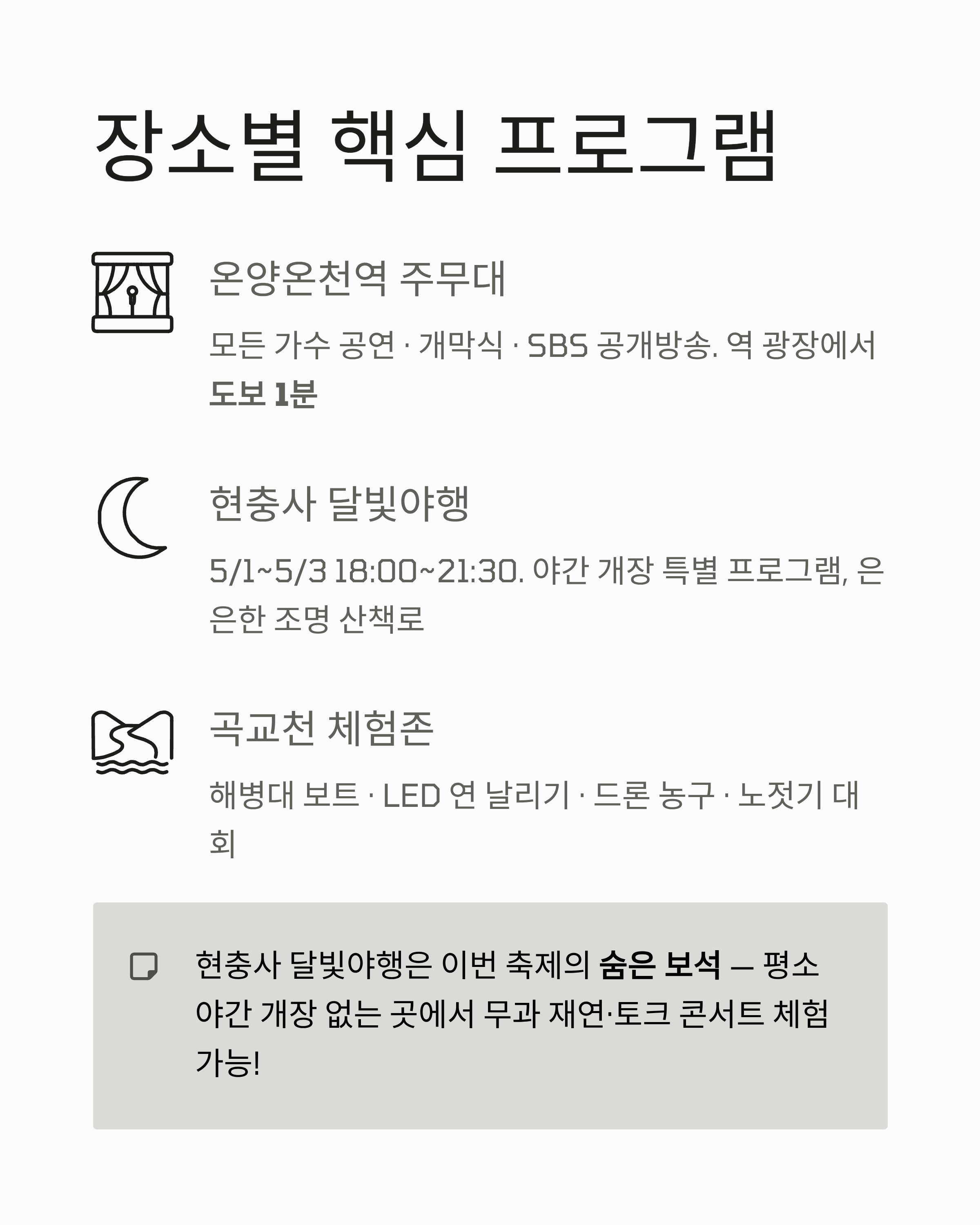 - 하이라이트: 4/30 개막식+드론쇼, 5/2 SBS 공개방송, 현충사 달빛야행